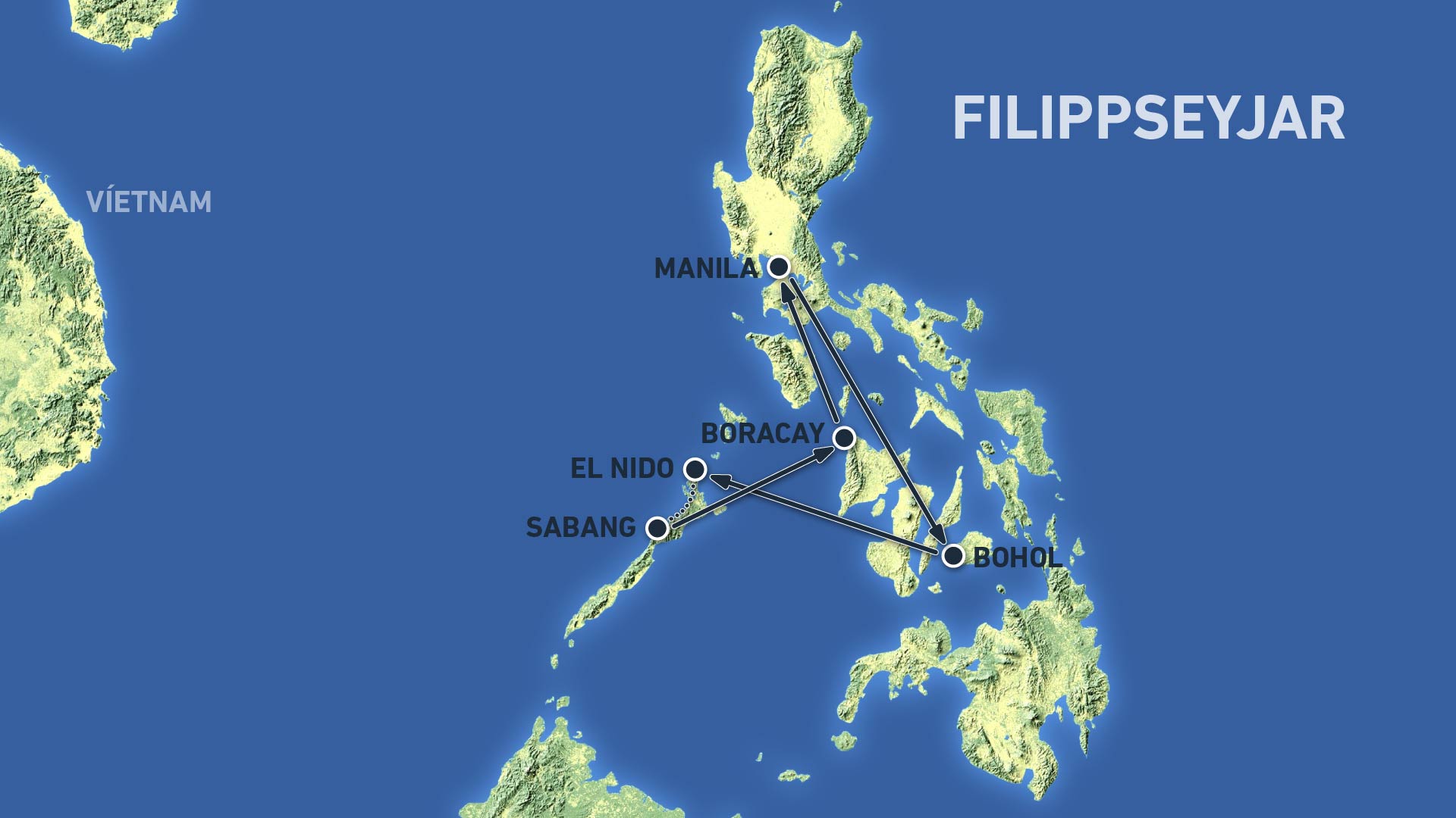 Við hefjum ferðina í höfuðborginni Manila á eynni Luzon, fljúgum til Bohol og skoðum ótrúlega náttúru og dýralíf, fljúgum síðan yfir Sulu hafið til eyjarinnar Palawan. Þar njótum við góðra daga í El Nido áður en við ökum gegnum græna regnskóga þessarar fögru eyju til suðurs á vit nýrra ævintýra í grennd við Puerto Princesa. Þar upplifum við meðal annars Puerto Princesa neðanjarðarána frægu (New 7 Wonders of Nature).